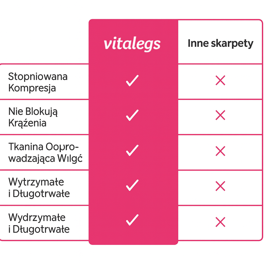 Krótko mówiąc... stworzyliśmy skarpety uciskowe, które naprawdę chcesz nosić! W przeciwieństwie do innych marek, które są albo zbyt ciasne, trudne do założenia, albo niewygodne, skarpety VitaLegs® zostały zaprojektowane tak, aby były łatwe w noszeniu, a jednocześnie zapewniały komfort i skuteczne ukojenie.