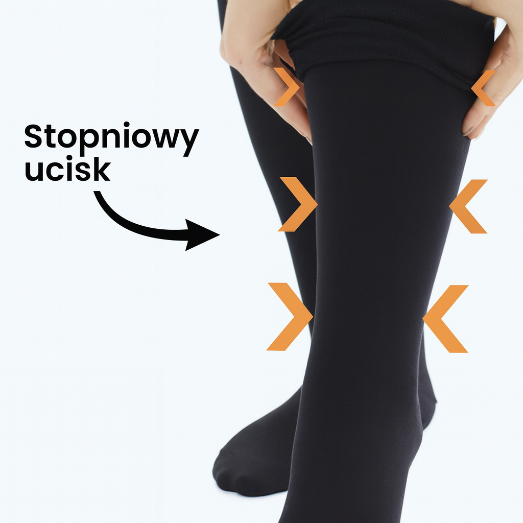 Zapewniają delikatną, stopniową kompresję, która poprawia krążenie krwi, zmniejsza obrzęki i łagodzi dyskomfort.